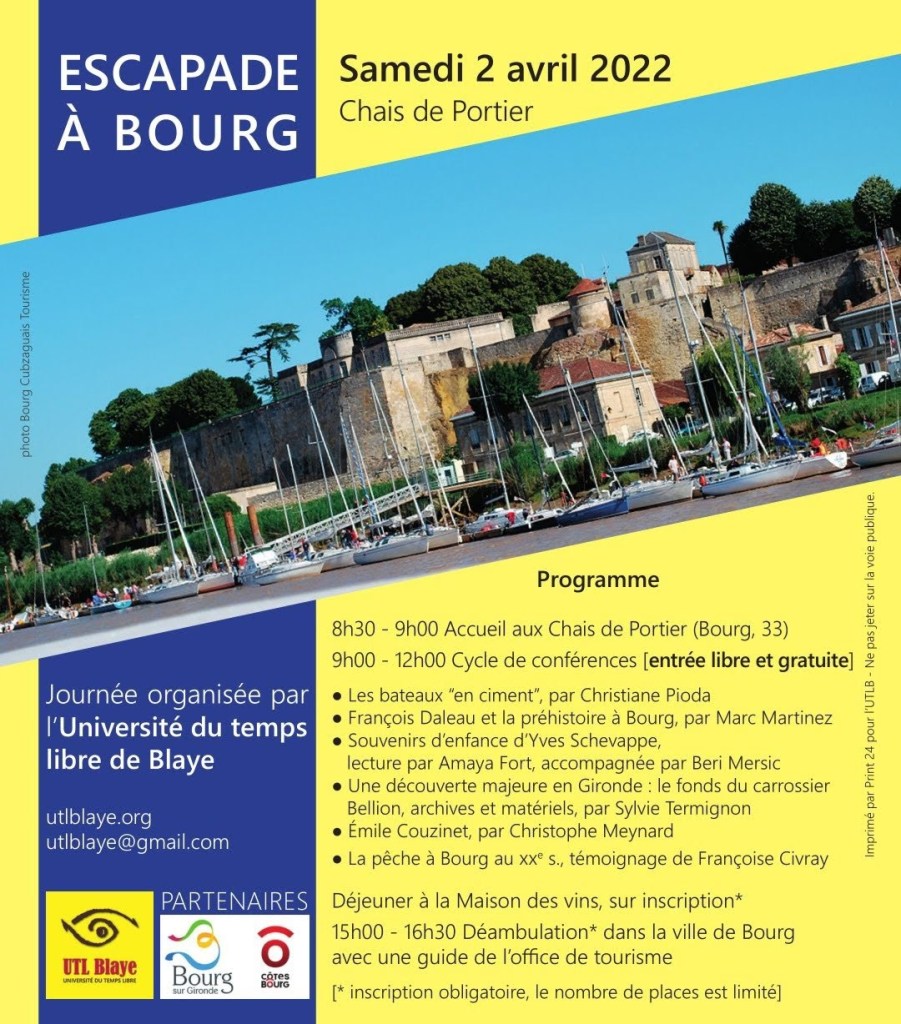 Dans le cadre de ses activités, l’UTLB organise une « Escapade à Bourg », ouverte à tous, qui aura lieu samedi 2 avril 2022 et se déroulera en deux temps : conférences durant la matinée et visites l’après-midi. Avec une pause déjeuner à la maison du vin.