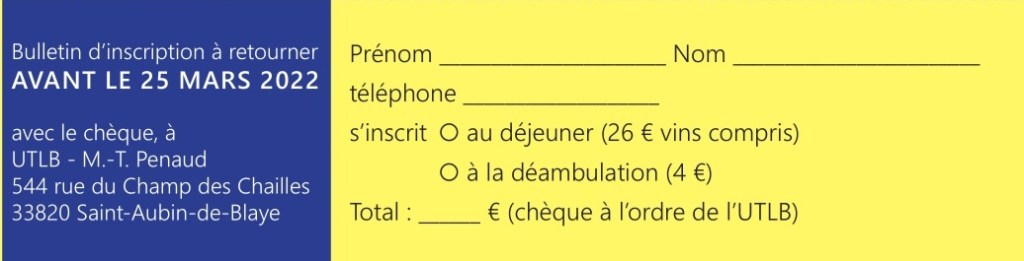 N’oubliez pas de remplir le bulletin pour vous inscrire avant le 25 mars, au déjeuner et/ou à la déambulation dans la ville, ou pas… Le nombre de places est limité.